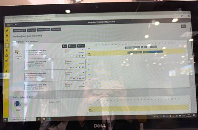 荷蘭自動化系統商 CELLRO 以「Factory of the Future」為主題,展示其完整的智慧製造整合架構,呈現從工單準備、機台排程到即時監控的全流程自動化能力。CELLRO核心產品 Manufacturing Intelligence (MI) 平台,如圖二十該平台能將 ERP、MES、CNC 機台與自動化單元連結,形成一個開放式的數位生產中樞。它可自動將生產訂單轉為具體的加工任務,並透過圖像化的「Real-time Production Cockpit」即時顯示每台機器的工單狀態、刀具與物料配置,讓管理者能隨時重排或優化排程,防止 CNC 停機與等待時間。