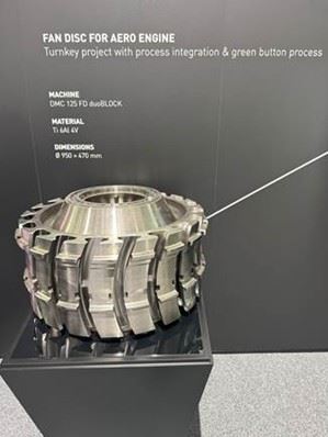 對航太業者而言,大型工件能否在提升效率的情況下,確保長時間加工精度為其重點。為此,DMG MORI於展會中展示飛機引擎渦輪盤(圖三)、引擎風扇輪等加工實績案例(圖四)。