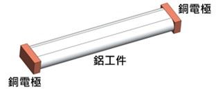 在短路加熱的設計裡,鋁工件會與銅電極直接接觸(如圖一),電流會透過銅電極進入鋁工件。但因為鋁和銅都是極佳的導熱材料,而銅電極需要持續水冷卻時,就會把工件邊緣的熱帶走(如圖二)。結果是:
