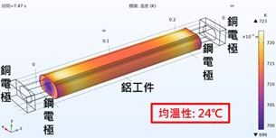圖二、鋁工件與銅電極直接接觸加熱溫度模擬結果圖