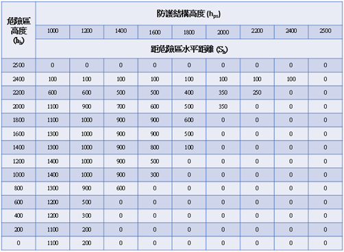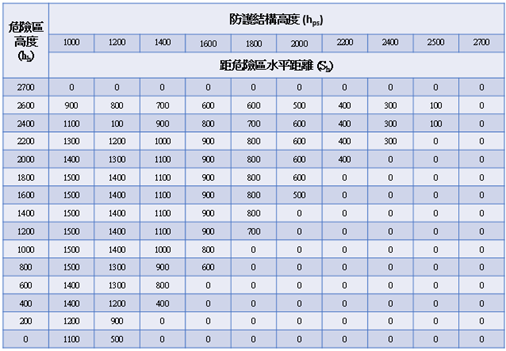 - 該表中的數值不能有任何插入值。如果防護結構高度h在兩個數值之間,則要使用較高h值的距離。