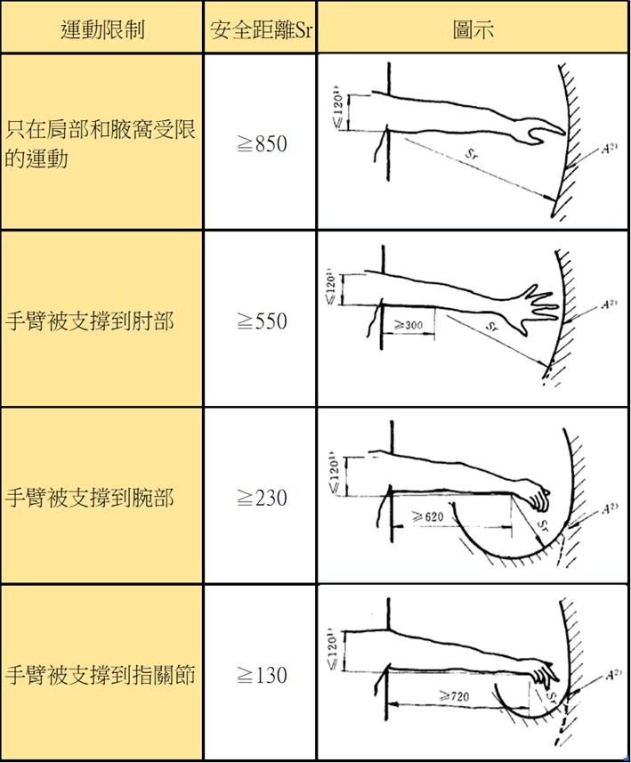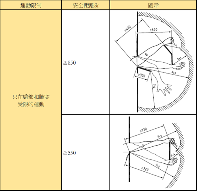 - 肩部和腋下活動受限(見圖八上欄位):兩個獨立的防護結構,一個允許從手腕移動,另一個允許從肘部移動,Sr1≥ 230mm,Sr2≥ 550mm,Sr3≥ 850mm。