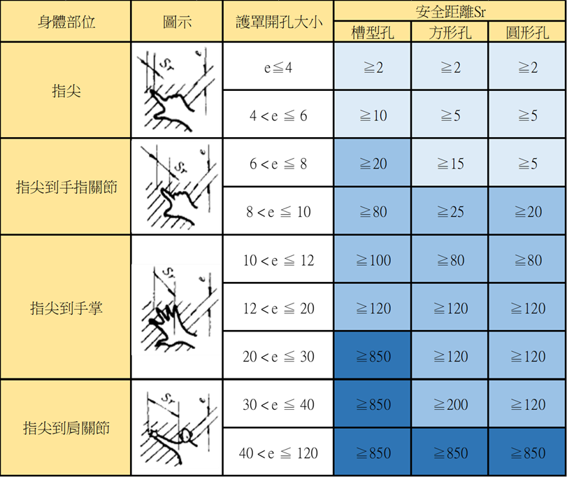 - 見圖七中的藍底色表格受開口尺寸限制的身體部分,因槽型開口四邊不等長,如開孔大小指的是最窄尺寸,而當長度小於等於65mm,大拇指就會形成阻擋,安全距離即可縮短至大於等於200mm,因此槽型開孔的安全距離會大於方形及圓形的安全距離。