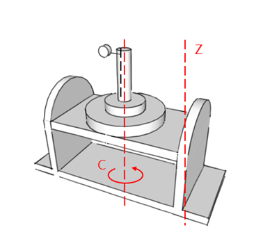 參考圖四,旋轉軸與線性軸的平行度:Z軸(垂直線性軸)的運動方向應與C軸(繞Z軸旋轉)的旋轉軸線保持平行。這是確保C軸旋轉時工作台與主軸姿態精準的基礎。