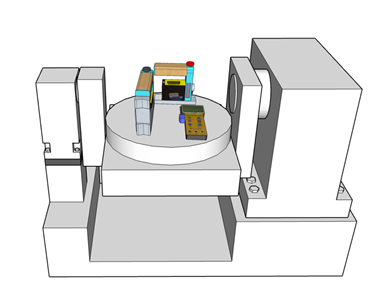 此基準狀態下的測試棒位置與姿態,將作為後續評估傾斜軸在正負 90 度或其他角度定位時,其旋轉中心軸、傾斜軸以及各軸間幾何關係是否正確的比較依據。詳細示意圖請參考圖十五、圖十六以及圖十七。