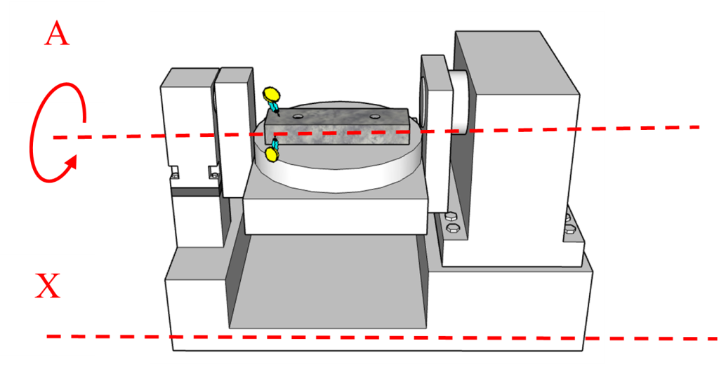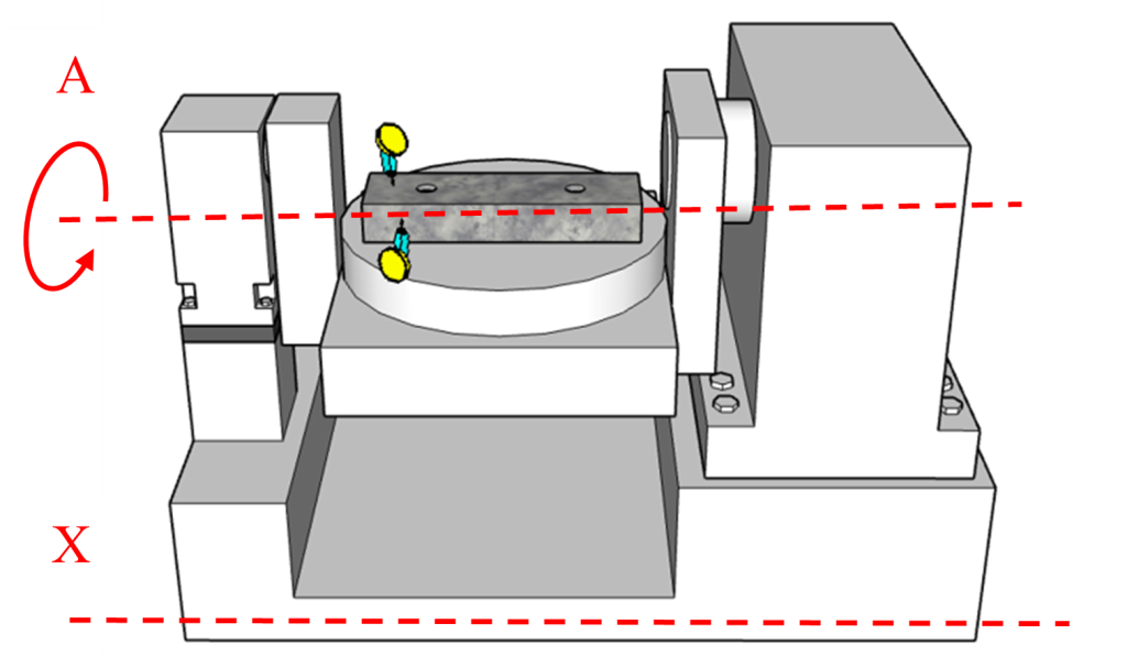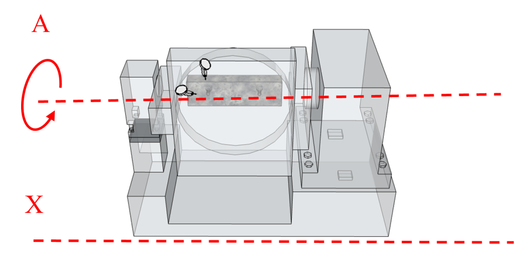 透過比對正 90 度、負 90 度以及基準 0 度位置所記錄的量表讀數(誤差值),這些量測數據直接反映了 X 軸線性運動方向與 A 軸之旋轉中心線之間的空間幾何關係是否正確。例如,若直規側邊在正負 90 度的讀數誤差呈現特定趨勢(如對稱性或線性增長),可能揭示旋轉軸與 X 軸的垂直度偏差、旋轉中心偏移或軸線不平行。透過誤差模式分析,可判斷機台幾何精度是否在合理規範內,以及後續是否需要調修的關鍵依據,詳細示意圖請參考圖十一、圖十二以及圖十三。