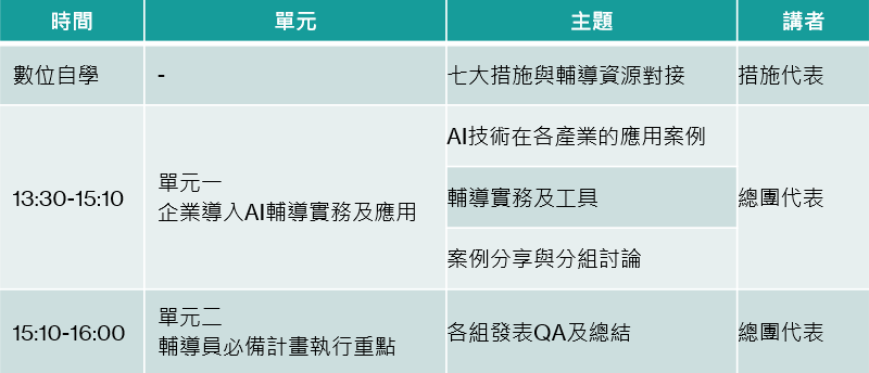 - 對象:具備AI導入1年以上經驗之輔導團成員
